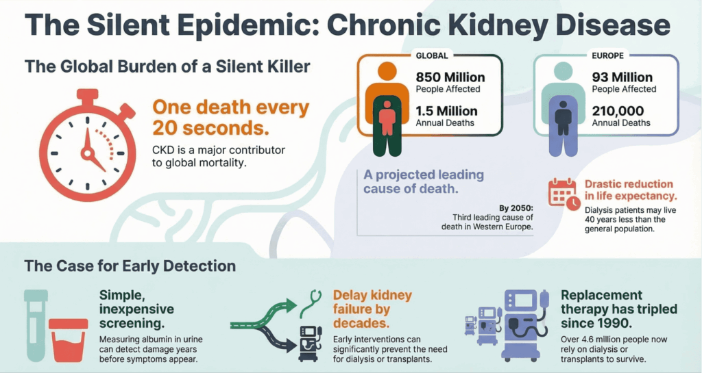 The scale of the problem is difficult to grasp at first glance. Across Europe alone, an estimated 93 million adults live with chronic kidney disease, and around 210,000 people die from it every year: one death every two and a half minutes.